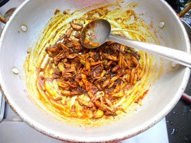 7.Add 4 tsp of chilly powder, 1/2 tsp of pepper powder, 1/4 tsp of turmeric powder, and salt. Fry this lightly on low flame till the raw smell goes.....taking care not to burn it.
